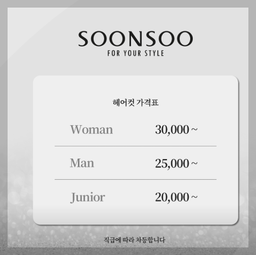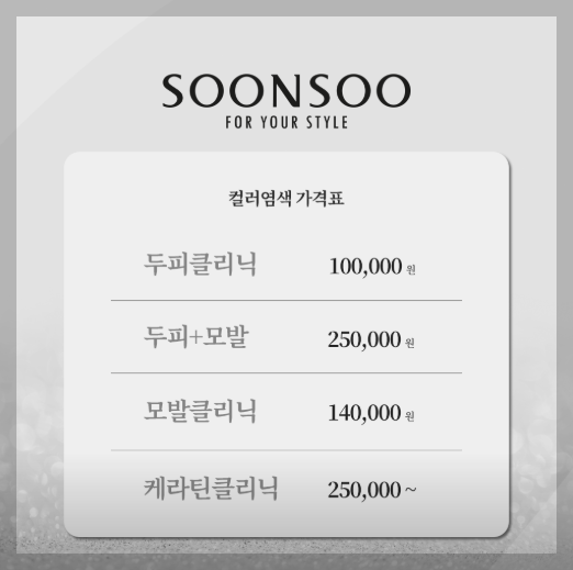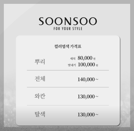 두피 케어와 모발 영양 관리도 받으실 수 있습니다. 헤어 서비스 과정은 상담 → 모발 상태 확인 → 맞춤 컬러 혼합 → 염색 → 트리트먼트 순으로 진행되며, 자연스러운 색상과 건강한 모발 유지에 초점을 맞추고 있습니다. 추가로 디자인 컬러나 포인트 염색을 원하는 경우 상담 후 맞춤 가격이 적용됩니다.