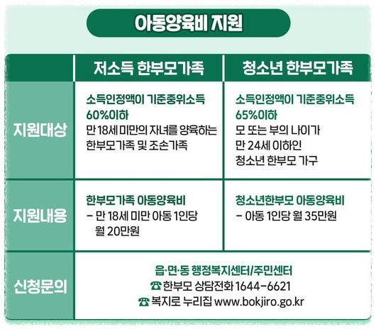 - 아동양육비 지원: 만 18세 이하 자녀가 있는 한부모가정에 양육에 필요한 비용을 지원합니다.