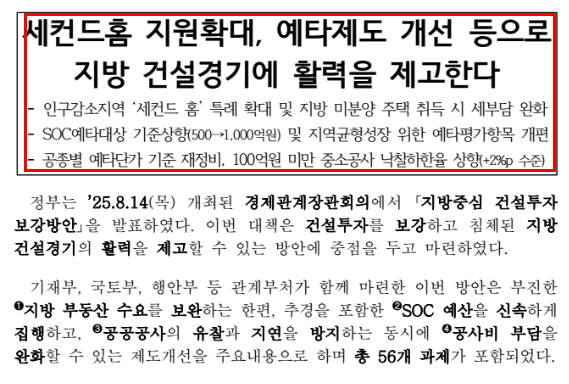 세컨드홈 제도는 단순히 세금 혜택만이 아니라 지방 균형 발전의 한 축으로 자리 잡고 있습니다. 정부는 이번 대책을 통해 SOC 투자, 지역 산업단지 활성화, 공공 건설 프로젝트 확대와도 연계할 계획입니다.