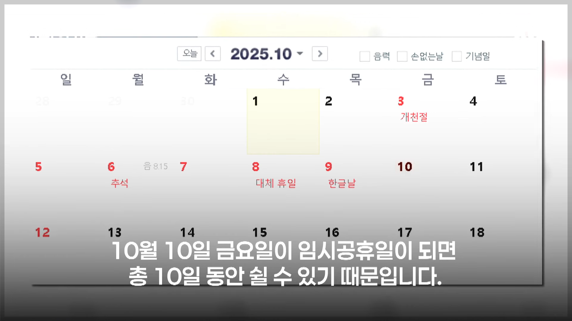 올해 초부터 올해의 휴일을 찾아보며 며칠이나 쉬나 기대하고 있던 모든 이들이 10월이 다가오길 바랐었죠, 10월이 다가오면서 많은 이들이 10월 10일을 임시공휴일로 지정하여 긴 연휴를 기대하고 있습니다.